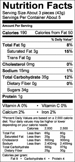 INGREDIENTS: Apples, pecan pieces, milk chocolate (sugar, cocoa butter, milk, chocolate liquor, soy lecithin - an emulsifier, vanillin - an artificial flavor), corn syrup solids, water, granulated sugar, evaporated milk (milk, dipotassium phosphate, carrageenan, Vitamin D), cream powder (cream, lecithin, tocopherols), butter (cream, salt), partially hydrogenated vegetable oil (cottonseed, soybean), salt, vanillin - an artificial flavor. CONTAINS MILK, PECAN, SOY. FACILITY PROCESSES PEANUTS AND OTHER TREE NUTS.