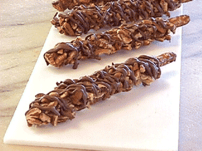 1. Dip pretzel rod in coating up to within about 1” of the end, shake and scrape off excess coating.